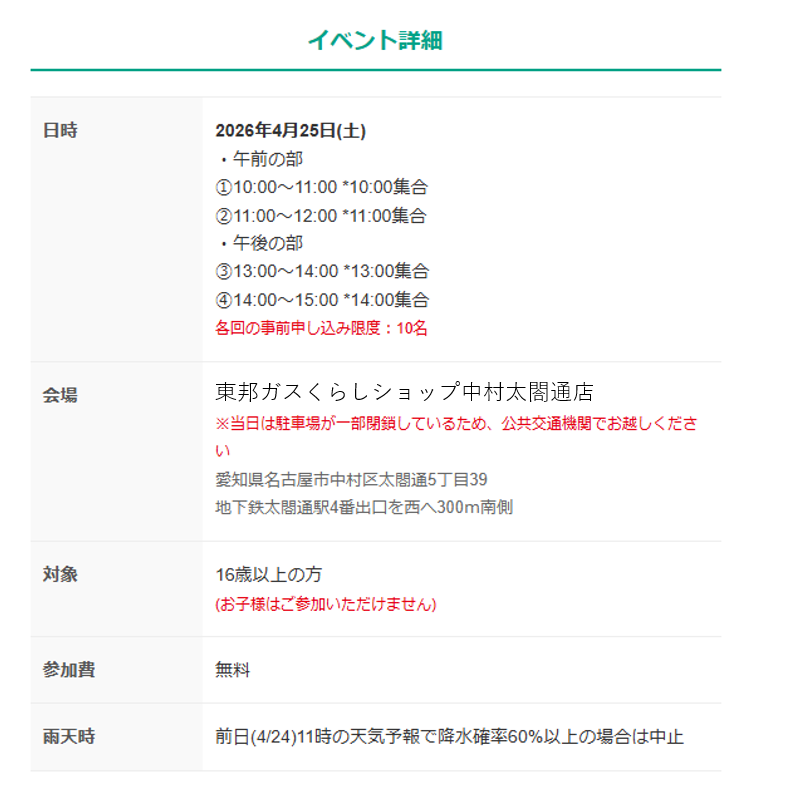 ・開催場所:東邦ガスくらしショップ中村太閤通店(愛知県名古屋市中村区太閤通5-39)